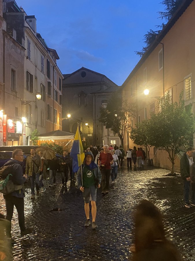 Am Abend versammelten sich alle im malerischen Stadtteil Trastevere zu einem typisch italienischen Abendessen in der "Trattoria degli Amici", die von der ► Gemeinschaft Sant’ Egidio betrieben wird und in der auch Menschen mit Beeinträchtigung arbeiten. Das sehr gute Essen, der freundliche Service und einige Flaschen guten Weins ließen schnell eine fröhliche Stimmung aufkommen, in der manches Erlebnis der vergangenen Tage nachklingen konnte.
