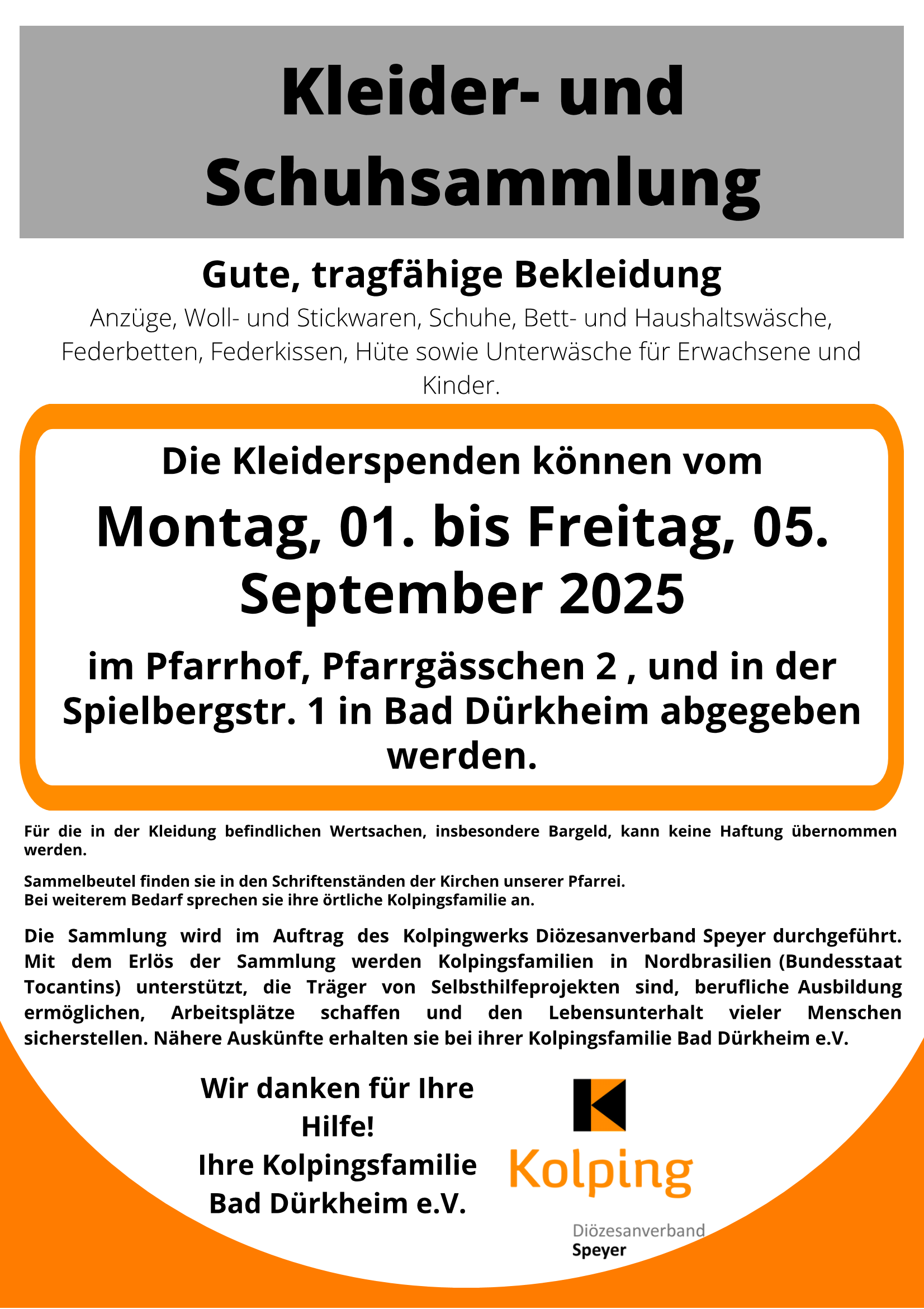 Die Kleiderspenden können vom Montag, den 01.09. bis Freitag 05.09. im Pfarrhof, Pfarrgässchen 2 und in dere Spiegelstraße1 in Bad Dürkheim abgegeben werden.
