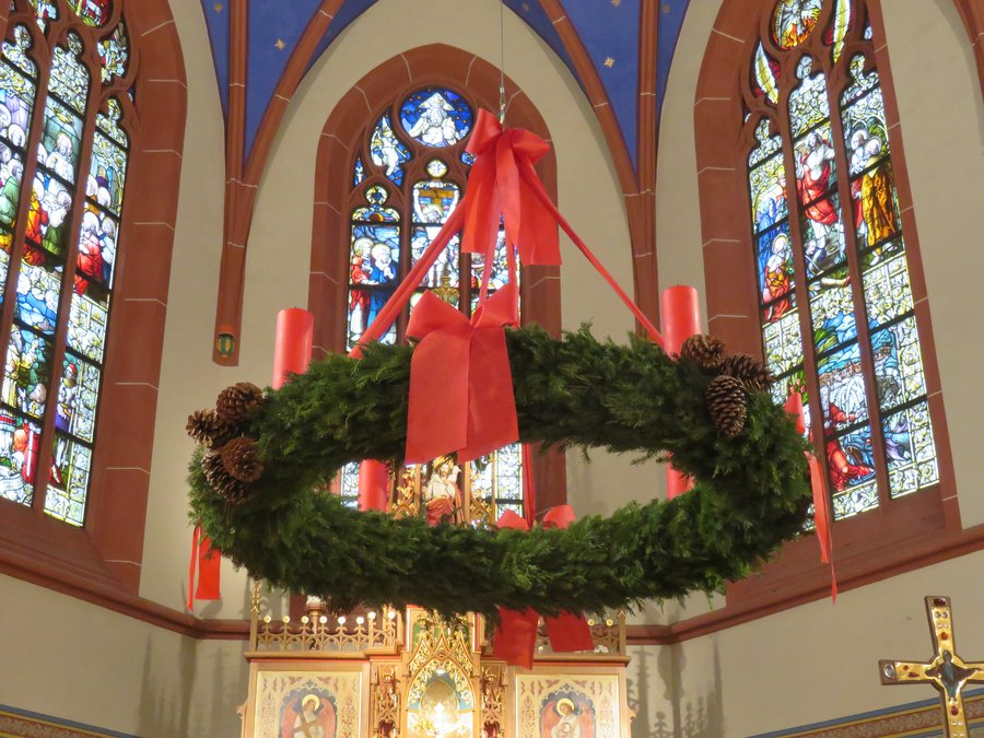 Dann wurde der Adventskranz in die Kirche getragen und an den Drahtseilen befestigt.