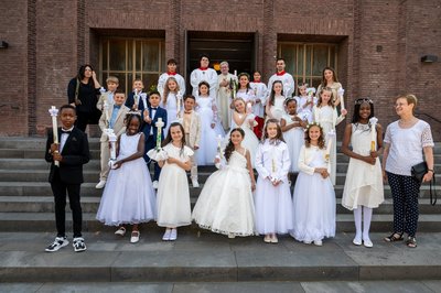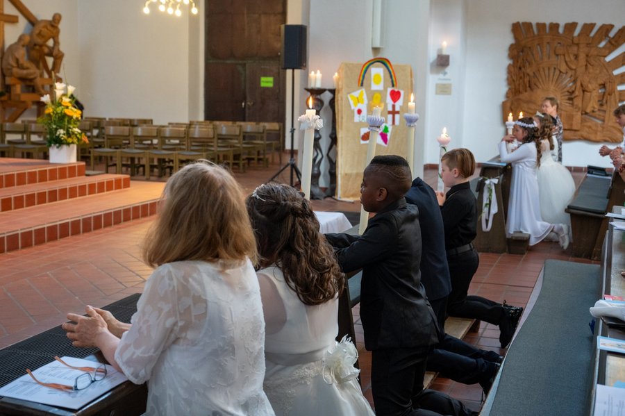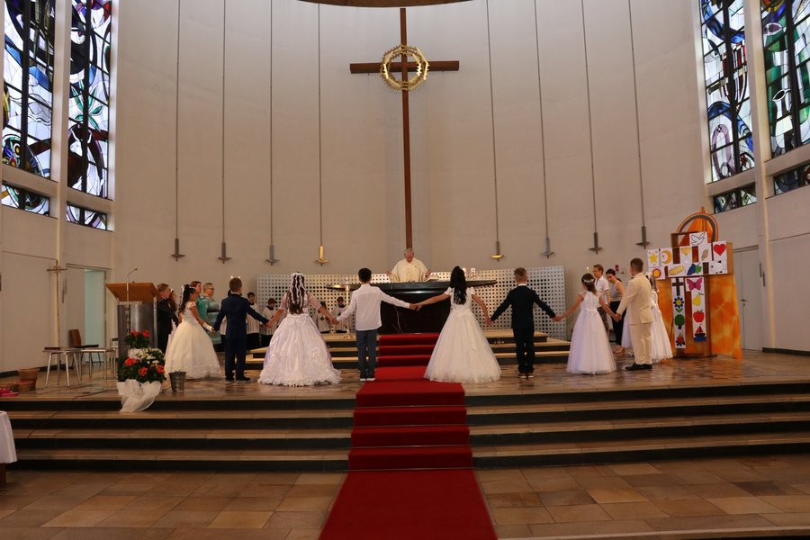Zum Vater unser versammelten sich die Kommunionkinder um den jeweiligen Altar. Zum Agnus Dei sangen die Kommunionkinder das Lied "Wir stehen hier um den Altar, werden still und leise. Jesus ist nun wirklich da, auf besondere Weise." Der Refrain "Nicht alles können die Augen seh'n, nicht alles kann der Verstand versteh'n. Gott ist in Gestalt von Brot und Wein unter uns." kann zweifelnden Menschen Mut machen, an die Liebe Gottes und seiner Zusage zu uns Menschen zu glauben und zu vertrauen.