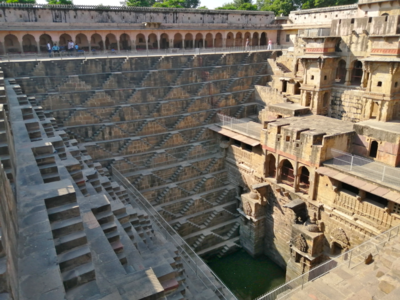 Im Anschluss besuchten wir ein typisches Dorf (Abhaneri) mit einem einmaligen Stufenbrunnen (Chand Baori). Dieser Brunnen entstand vor ca. 1000 Jahren, beinhaltet 13 Stockwerke mit 3500 Treppenstufen und in 20 m Tiefe findet sich ein quadratischer Brunnen, der heute immer noch Wasser führt.