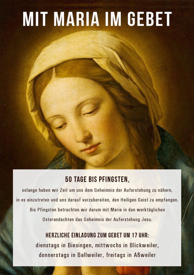 Bis Pfingsten betrachten wir darum mit Maria in den werktäglichen Osterandachten das Geheimnis der Auferstehung Jesu.