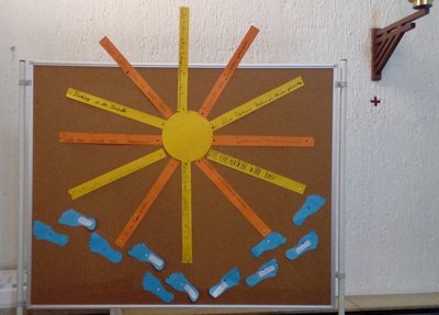 "Unterwegs auf neuen Wegen", so waren diese Gottesdienste unter der Leitung von Vikarin Hildrun Mittelstädt und Pastoralreferent Heinrich Schmith überschrieben. Dabei wurden die Wege bedacht, die im vergangenen Schuljahr von den Schülerinnen und Schülern gegangen wurden. Mit Sonnenstrahlen sammelten sie die schönen Erinnerungen und mit Fußspuren die Hoffnungen für das, was im kommenden Schuljahr auf sie zukommt.
