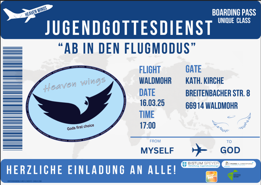 Lasst euch ein auf eine spannende und interaktive Wortgottesfeier zum Thema „Flugmodus“, veranstaltet von Jugendlichen aus der Pfarrei Hl. Christophorus, dem BDKJ Nordpfalz und der Jugendkirche.