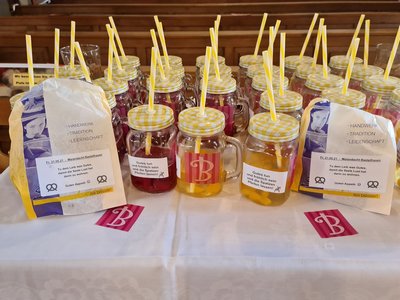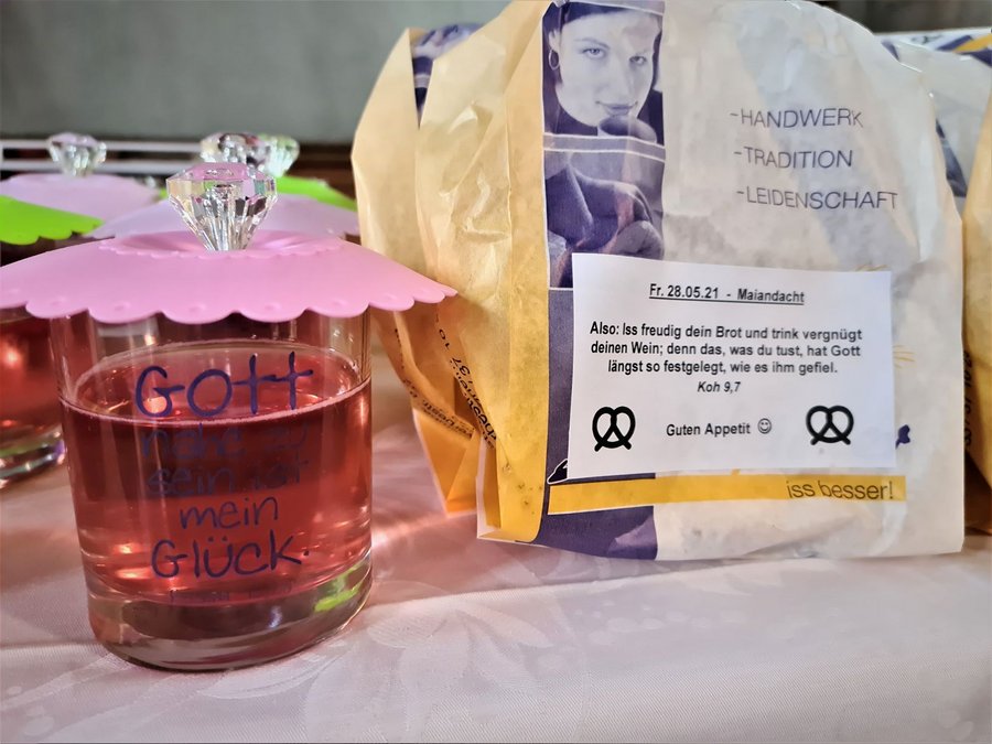 Zum Abschluss des Marienmonats folgte am letzten Freitag des Monats noch eine von Bianka Wüst gestaltete Maiandacht mit Lebenssituationen Mariens als Thema. Die mitgebrachten Blumen mündeten in dem Gebet „O gib den Blumen in dem Strauße Stimmen und lass dadurch unser Rufen zu dir dringen“. Auch hier wurde der Nachhauseweg verschönert und es gab originelle Gläser mit Bibelsprüchen gefüllt mit Secco und einer „Biblischenbrezel“.