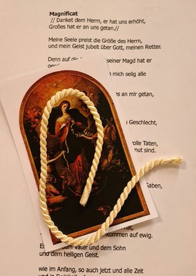 Den folgenden Freitag gestalteten die Bastelfrauen die Maiandacht. Unter dem Thema „Maria Knotenlöserin“ waren im Vorfeld einige Bastelfrauen aktiv gewesen und hatten schöne Bänder gebastelt, die ganz spontan als Armband oder Taschenband von einigen Teilnehmer benutzt wurden. Da die Bowle danach noch nicht stattfinden konnte, wurde am Ende der Maiandacht wieder unsere schon bekannte „ Bowle to go“ angeboten und jeder Gottesdienstbesucher hatte eine schöne Wegzehrung.