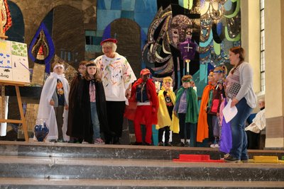 „Weißt du, dass dein Leben bunt ist?“ Unter diesem Motto gestalteten die beiden Kindertagesstätten der Gemeinde Maria vom Frieden den Familiengottesdienst am vergangen Sonntag in der Pfarrkirche in Erbach. Dabei hatten sich die Erzieherinnen etwas ganz Besonderes ausgedacht: Mit farblich unterschiedlichen Umhängen saßen die Kindergartenkinder auf den dazu farblich passenden Kissen, umrahmt durch die entsprechend bunt ummantelten Hula-Hoop-Reifen, sodass der Eindruck erweckt wurde, man hätte einen überdimensionalen Farbkasten vor Augen. Eine Staffelei und natürlich ein bunt bekleckster Maler rundeten das Bild ab. Die Kinder wurden durch den Pinsel des Malers lebendige Farben und erklärten der fasziniert zuhörenden Gemeinde, was Ihre Farbe bedeutet. So sagte z.B. Fabian: „Ich bin die Farbe Orange und ich stehe für die Freundschaft“ oder Laurenz: „ Ich bin die Farbe braun und stehe für das (Un-)wichtige in deinem Leben“ konnten manchen Zuhörer nachdenklich stimmen.