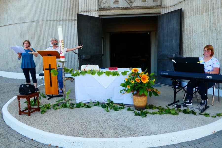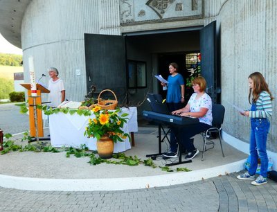 Rund 50 Frauen und Männer machten sich aus allen Teilen der Pfarrei und über die Pfarreigrenzen hinaus auf den Weg nach Herbitzheim, wo bei herrlichem Wetter auf dem Vorplatz der St. Barbara Kirche Gottesdienst gefeiert wurde. Wortgottesdienstleiterin Susanne Karl begrüßte die Schar herzlich und machte auf ein kleines Jubiläum aufmerksam. Vor zehn Jahren wurde der "Tag der Schöpfung" auf dem Ökumenischen Kirchentag in München von der Arbeitsgemeinschaft Christlicher Kirchen Deutschlands (ACK) ausgerufen und begeistert davon hatte Susanne Karl die Idee, ihn in Herbitzheim einzuführen. Ununterbrochen feiern seitdem die Menschen im Bliesgau diesen besonderen Tag im September und machen damit auf die christliche Verantwortung zur Bewahrung der Schöpfung aufmerksam. Jedes Jahr mit einem anderen Motto - 2020 wählte die ACK das Thema WEINKLANG. In der Wortschöpfung steckt neben dem „Wein“ – auch das Wort „Einklang“. Den Bedeutungen und der dahinter steckenden Symbolik wurde im Gottesdienst auf den Grund gegangen. Die Botschaft der Weinstock-Rede Jesu, die Ermutigung zu einer Kultur der Achtsamkeit und des Mitgefühls, Impulse und Fürbitten mündeten in ein Gebet mit Leib und Seele. "Alles ist möglich, dem der liebt..." - dieses Lied der Gruppe Ruhama fordert dazu heraus, sich in die Liebe Gottes zu stellen und das eigene Herz zu öffnen für die Mitwelt. Die Teilnehmenden ließen sich gerne auf die von Susanne Karl angeleiteten Gebärden ein - unter freiem Himmel ein besonderes Erlebnis für alle Sinne.