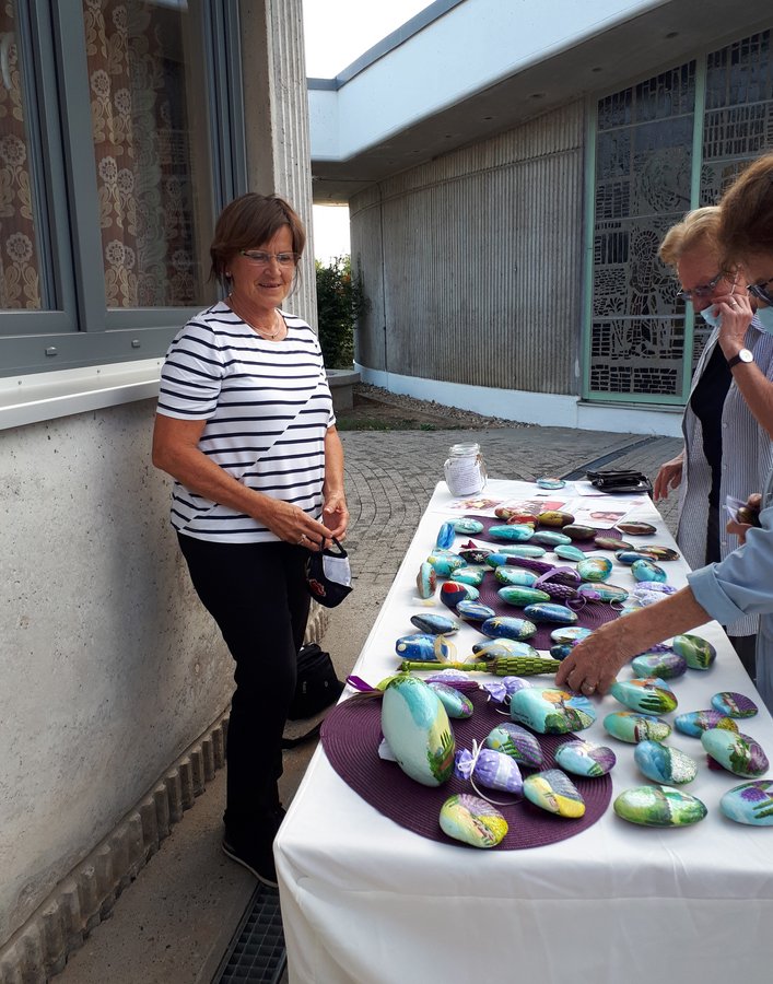 Am Ende durfte auch ein herzliches Dankeschön nicht fehlen an alle, die gekommen waren: an die Mitwirkenden (Julia Weyer am E-Piano, Bettina Scheunig, Gertrud Schwartz, Pfr. Scheliga und Katharina Mees) und alle, die den Platz bestuhlt und hergerichtet hatten. Mit dabei war in diesem Jahr erstmals auch Otti Leiner aus Herbitzheim, die einen Tisch mit selbst gefertigten Geschenkartikeln (Lavendelkissen, bemalte Steine und mehr) auf Spendenbasis anbot. Der stolze Betrag in Höhe von 554 Euro kam zusammen. Die Spenden werden unmittelbar an das Projekt "Hilfe für Straßenkinder in Marokko" weitergeleitet.