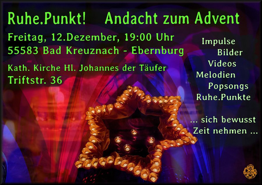 Die Kirche wird dazu in einem ganz anderen Licht erscheinen. Außerdem werden Bilder, moderne und aktuelle Popsongs sowie Videos auf einer 4 x 3 m Leinwand auf Sie wirken. Nehmen Sie sich ein wenig Zeit und spüren Sie den Advent als Zeit der inneren Vorbereitung und nicht als die stressigste Zeit des Jahres. Setzen Sie Ihren ganz persönlichen Ruhe.Punkt, auch wenn es Ihnen so gar nicht leichtfallen mag oder aber Ihr Kopf voller Termine und Verpflichtungen keine rechte Ruhe zulassen mag. Gerade dann ist es so wichtig einmal innezuhalten, eine Pause einzulegen, Kraft zu sammeln oder einfach nur durchzuatmen. Wir freuen uns auf Ihren Besuch.