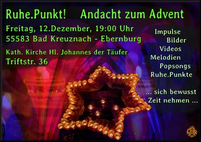 Bewusst den Advent als die Vorbereitungszeit auf Weihnachten nutzen, denn in einer Zeit, die uns alle so vieles abverlangt, wollen wir zur Ruhe kommen. In stimmungsvoller Atmosphäre wollen wir Texte, Impulse, Bilder, Musik, Videos und ganz persönliche Ruhe.Punkte auf uns wirken lassen und dabei nicht nur die äußere Ruhe wahrnehmen.