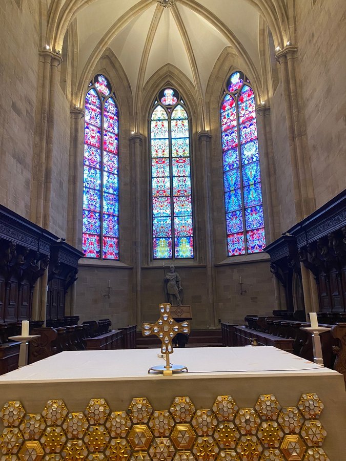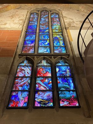 Dabei ging es nicht nur um die Chorfenster der Abteikirche, die mit Gerhard Richter der weltweit bedeutendste Künstler der Gegenwart gestiftet hat. „Diese Fenster“, so P. Wendelinus, „waren sogar der New York Times eineinhalb Seiten wert“. Ganz anders als die abstrakten Fenster von Richter bestachen die übrigen Fenster der afghanischen Künstlerin Mahbuba Maqsoodi durch kräftige Formen und Farben. Auch alles, was P. Wendelinus über die Geschichte und die Architektur des Klosters, das Leben im Kloster und theologische Hintergründe erzählte, ließ die Anwesenden aufhorchen.