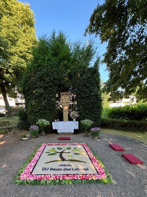 In diesem Jahr waren wir auch verbunden mit der Fronleichnamsprozession in Ayl (bei Saarburg). Dort gefiel den Organisatoren der Blumenaltäre das Logo unserer Pfarrei so gut, dass sie uns um Erlaubnis baten, das Logo als Blumenteppich legen zu dürfen. Das Ergebnis konnte sich sehen lassen!