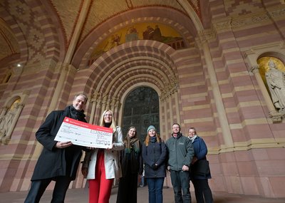 Freude über den Scheck der Dr.-Albrecht-und-Hedwig-Würz-Stiftung in der Bürgerstiftung der Sparkasse Südpfalz (v.l.n.r.): Domdekan Dr. Georg Müller, Christin Sauer, Vorständin der Bürgerstiftung der Sparkasse Südpfalz, Diplom-Restauratorin Anne Lackner, Dombaumeisterin Hedwig Drabik, Steinmetz Tobias Uhrig und Architektin Marta Schiedermaier © Domkapitel Speyer, Foto: Klaus Landry