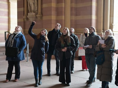 Christin Sauer, die seitens des Stiftungsvorstands der Bürgerstiftung Sparkasse Südpfalz an dem Termin teilnahm, freute sich sehr über den sichtbaren Erfolgt der Maßnahme: „Es ist schön, dass wir mit der Bürgerstiftung in der Region und für die Region wirken können. Der Stifter, Dr. Albrecht Würz, der selbst Chemiker, war hätte an diesem Projekt, bei dem chemische Zusammenhänge eine große Rolle spielten, sicher seine Freude gehabt“. 60.000 Euro hatte die Würz-Stiftung für die Gerüststellung, die Untersuchungen und die Notsicherungsmaßnahmen bereits zur Verfügung gestellt. Abgeschlossen ist die Restaurierung des Wandgemäldes jedoch noch nicht. „Nachdem nun ein Konzept erstellt wurde, können wir als nächsten Schritt die Kosten ermitteln“, sagte Dombaumeisterin Hedwig Drabik. Realisiert werden kann die Restaurierung der teils mehrfach übermalten und retuschierten Flächen dann, sobald die hierfür erforderlichen Mittel vorhanden sind.