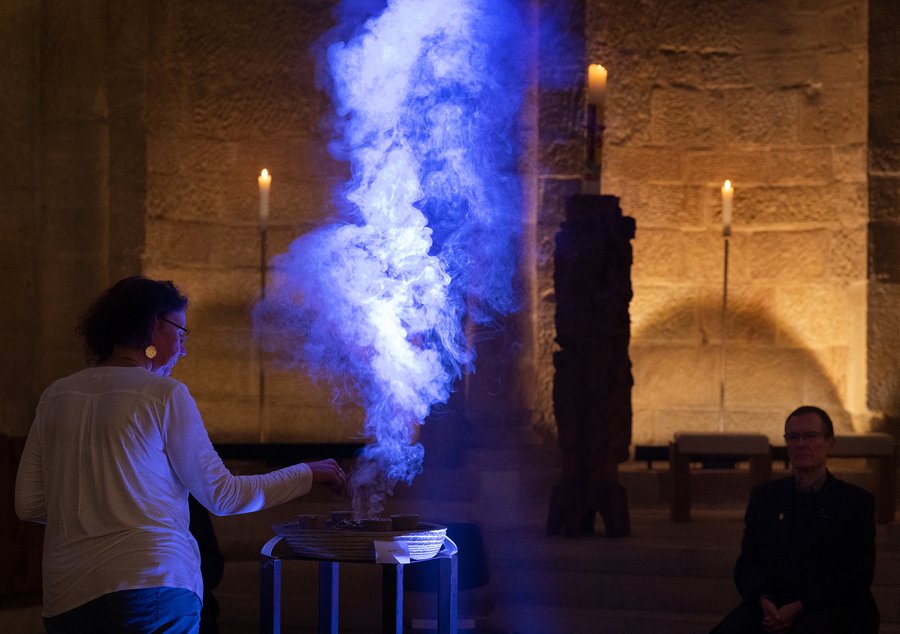 Zu dem biblischen Wort „Auf steige mein Gebet zu dir wie Weihrauch vor dein Angesicht“ (Ps 141,2) greift der Gottesdienst das Thema „bitten – Fürbitten“ auf. Nach einem Impuls dazu wird Zeit sein, seine persönlichen Bitten aus dem Herzen kommen zu lassen. Danach haben die Mitfeiernden die Gelegenheit, im Sinne des Psalmwortes ihre Bitten sinnenhaft „zu Gott aufsteigen zu lassen“: Es wird eine große Weihrauchschale aufgestellt, in die die Mitfeiernden Weihrauchkörner einlegen können, mit deren Rauch dann ihre Fürbitten symbolisch zu Gott getragen werden. Lieder und der Segen runden den Gottesdienst ab.